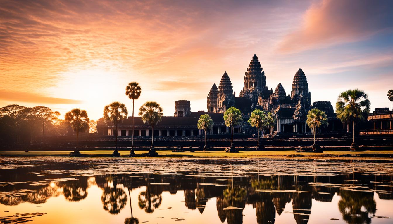 The Cambodian landmarks of Angkor Wat have a deep history and a mix of Khmer architecture. They show the skill and cultural heritage of the Khmer people. From tall spires to detailed carvings, every part of this site tells us about the Khmer empire’s creativity and legacy.